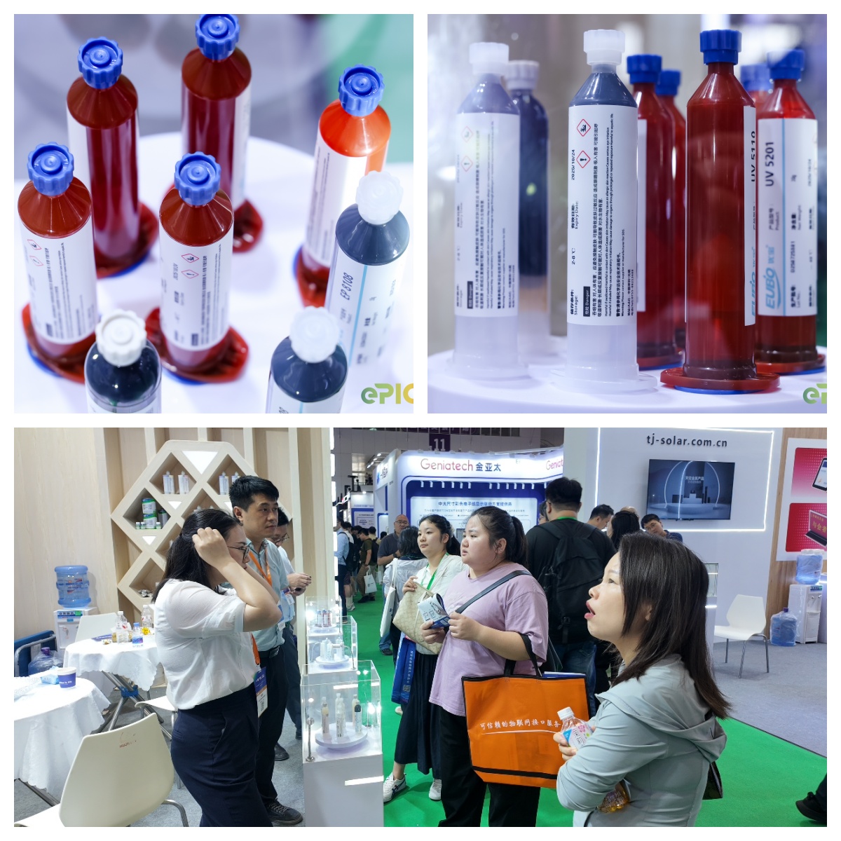 EUBO優寶的展位展示了多款專為電子紙邊框和OLED顯示屏封邊設計的膠黏劑,涵蓋了PUR熱熔膠、OLED模組邊框膠、UV膠等,均采用了先進的UV光固化技術,確保在提高粘接強度的同時,實現快速精準的定位與高效裝配。